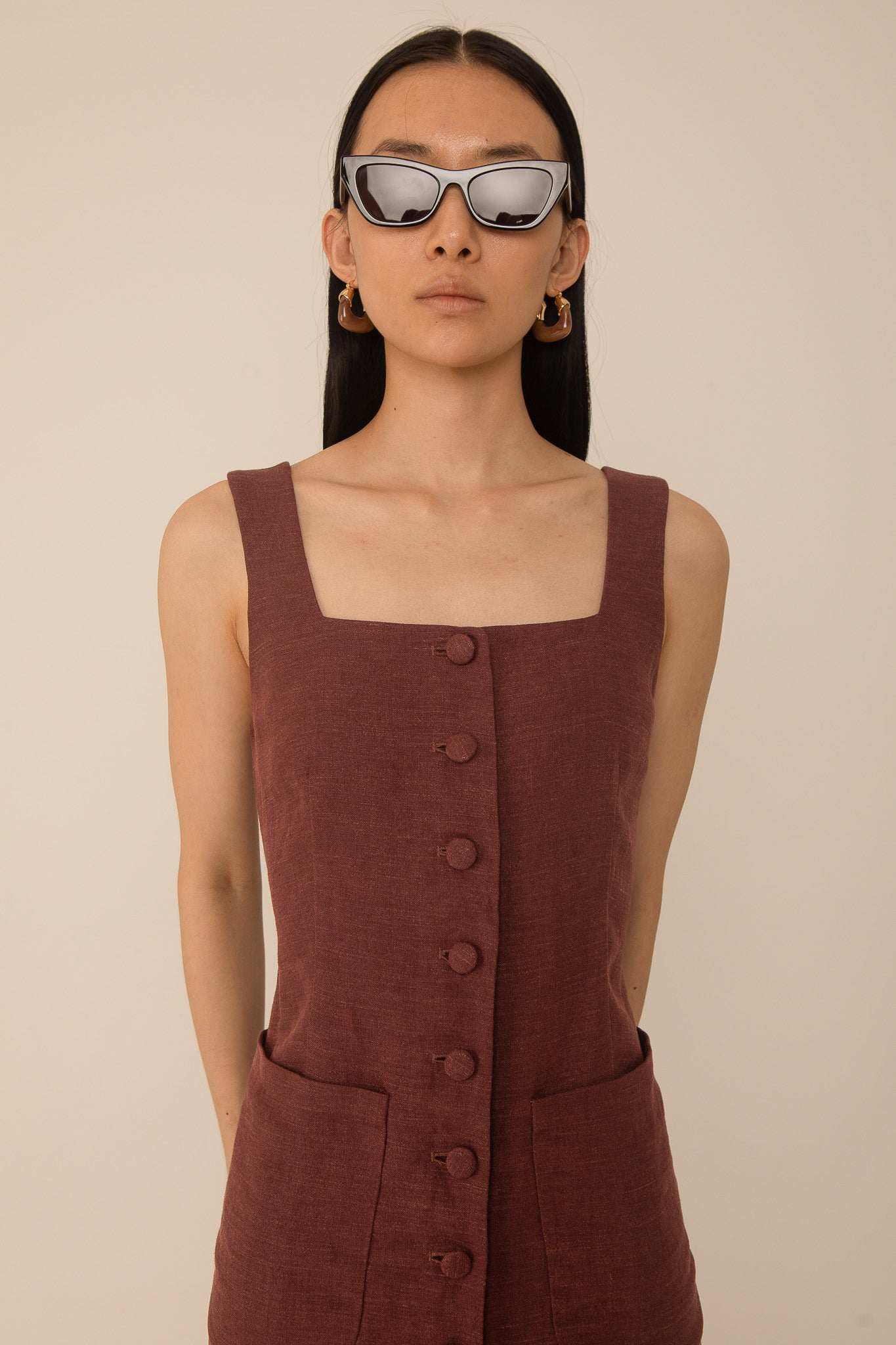| The Cleo Button Through sleeveless midi-dress is crafted from 100% linen, featuring a square neckline and covered button detailing through the front. A neat structure and subtle front split give a crisp, contemporary shape that feels effortless and refined. |
