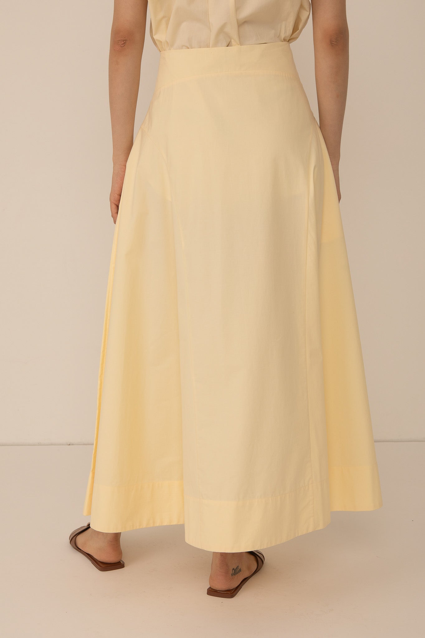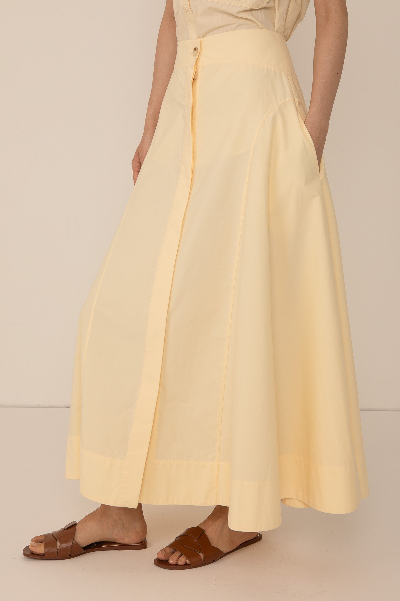 | Made with 100% cotton, the Fleur Skirt in pale yellow is soft, breathable and moveable. This long skirt features concealed buttons running down the central seam, and flowing side panels for a chic a-line silhouette. |