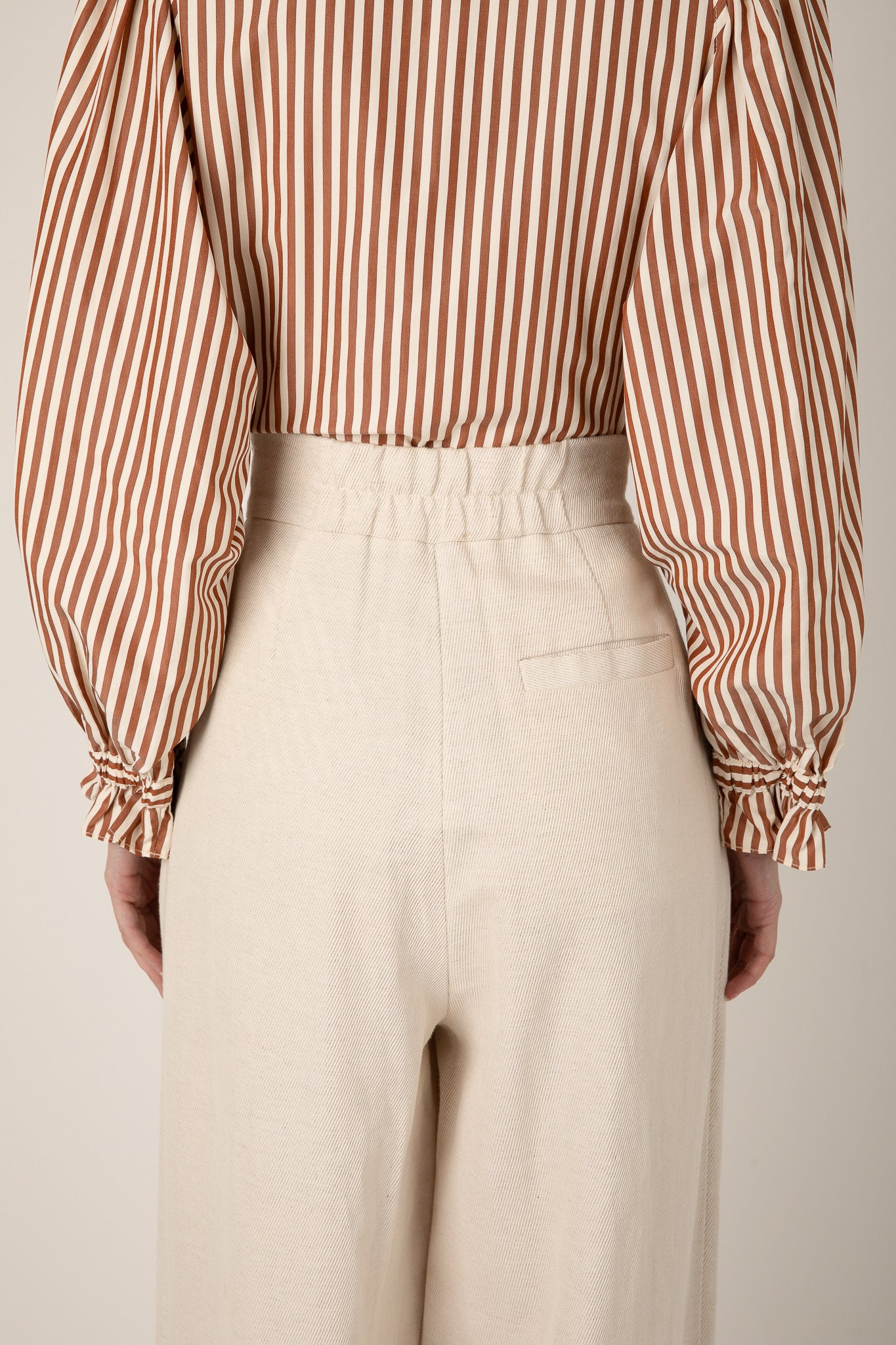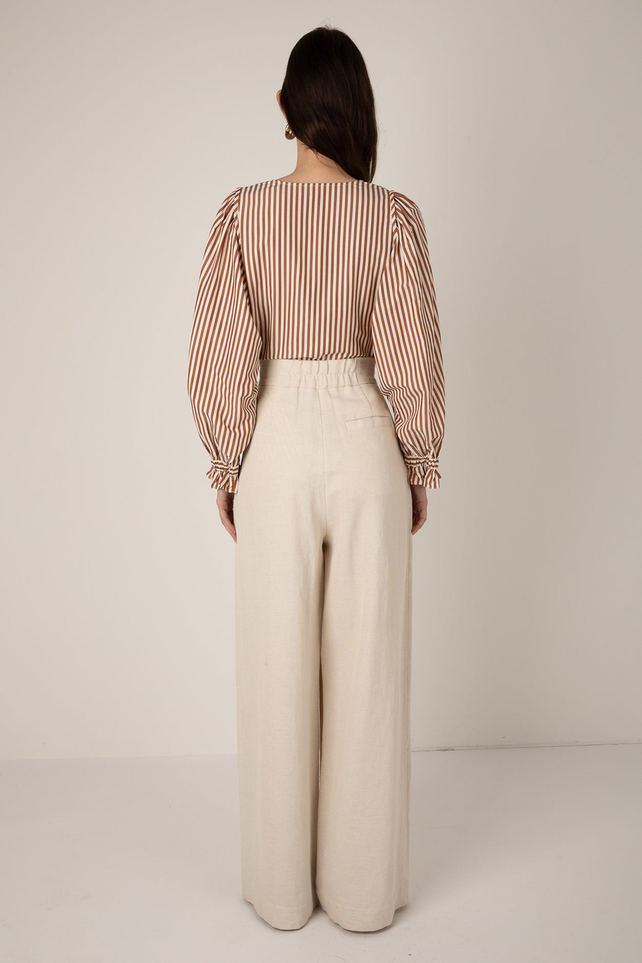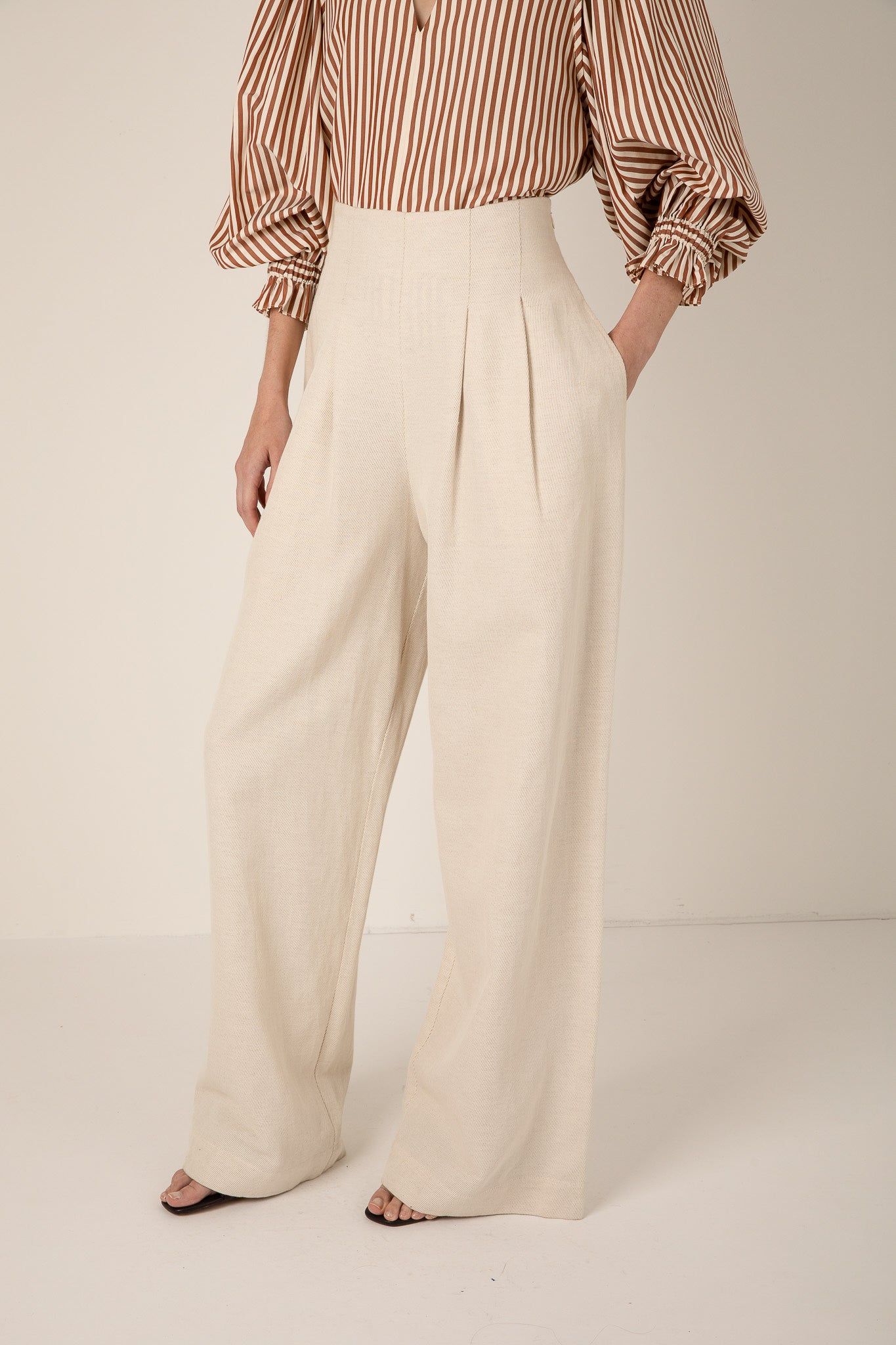 The NELLIE trouser in a linen blend featuring a flattering high-waisted pleated design, with two pockets for ease. The fit hugs the waist for an elegant silhouette. Also available in Black.