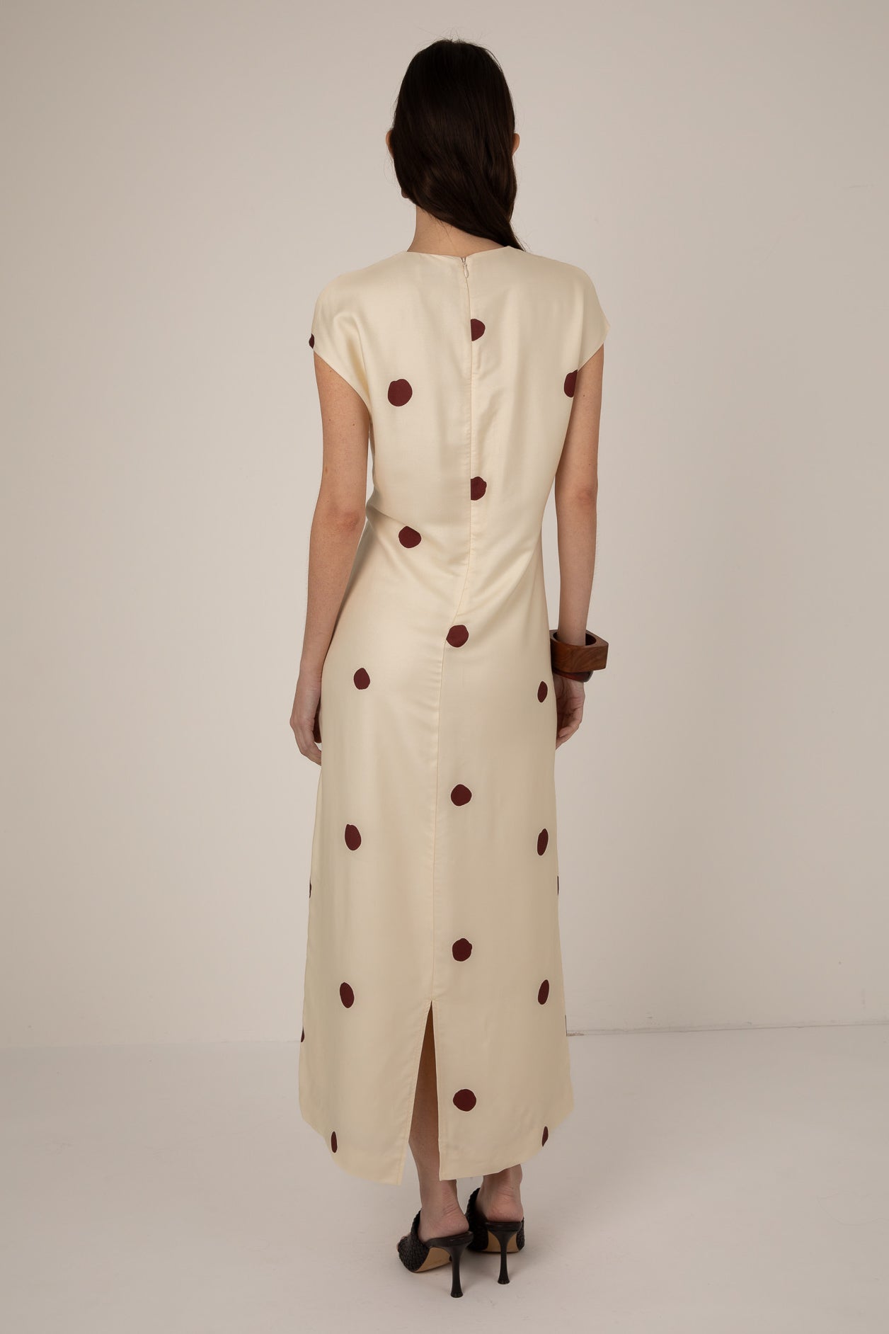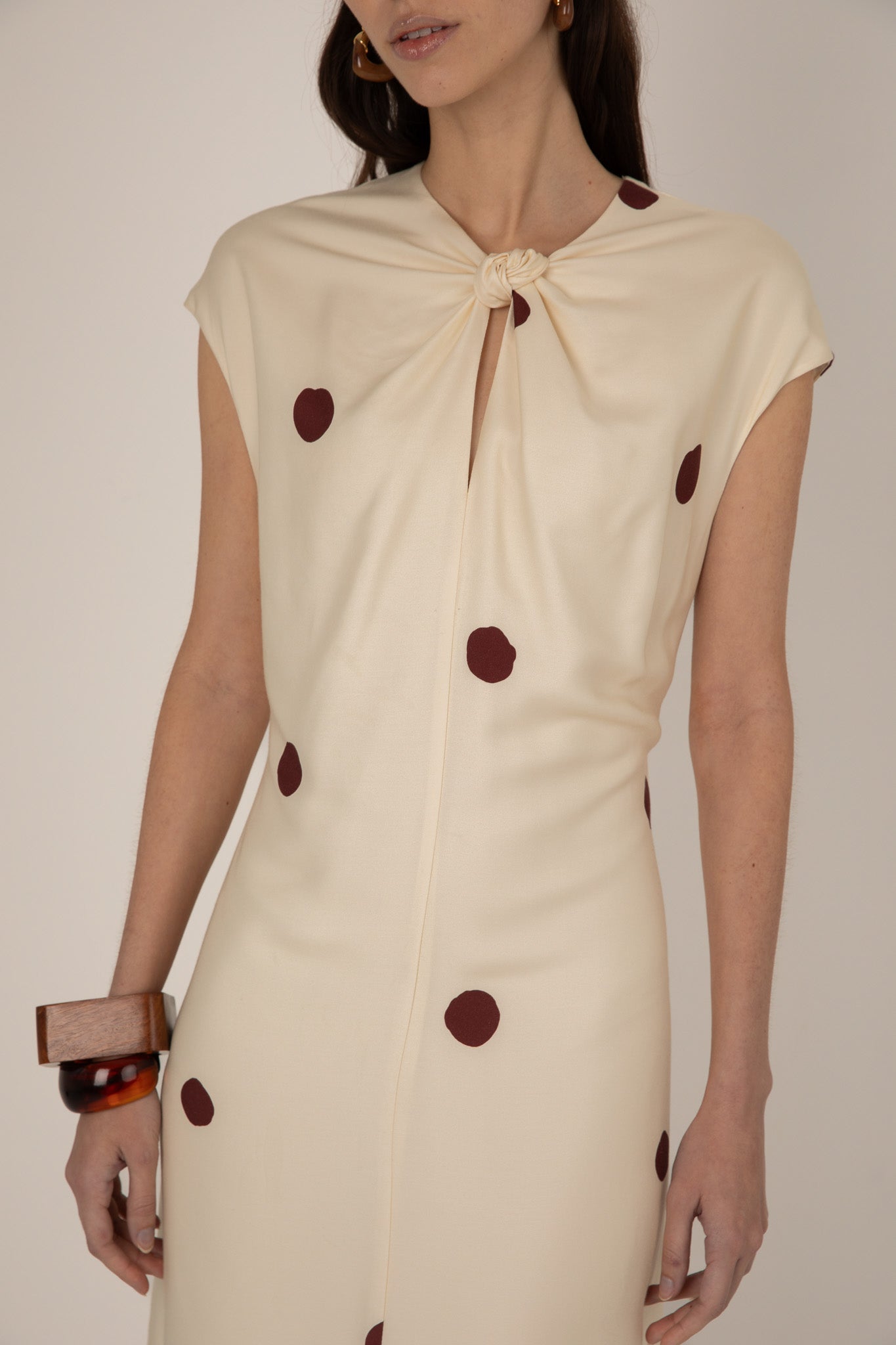 This long midi dress features a sleek column silhouette with capped sleeves and a keyhole tie neckline for a refined, feminine finish. Cut from silk and viscose and patterned with playful oversized contrast spots, it falls effortlessly to the ankle for a contemporary flattering statement.